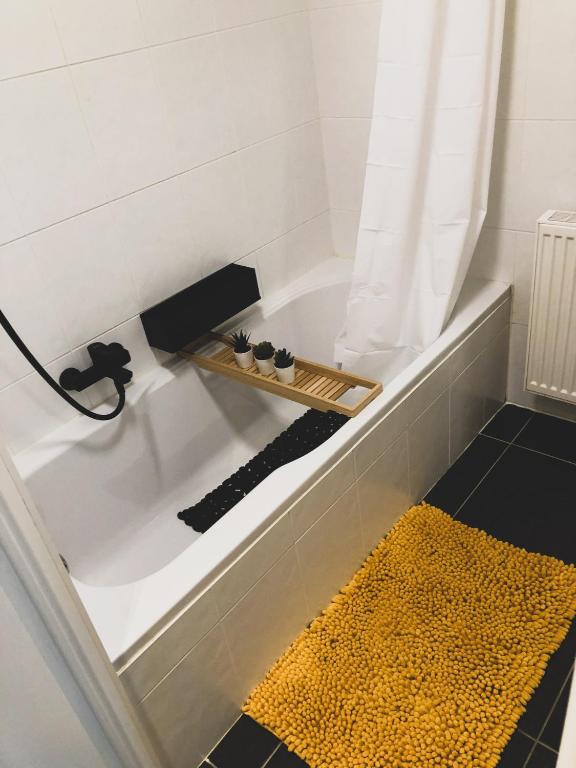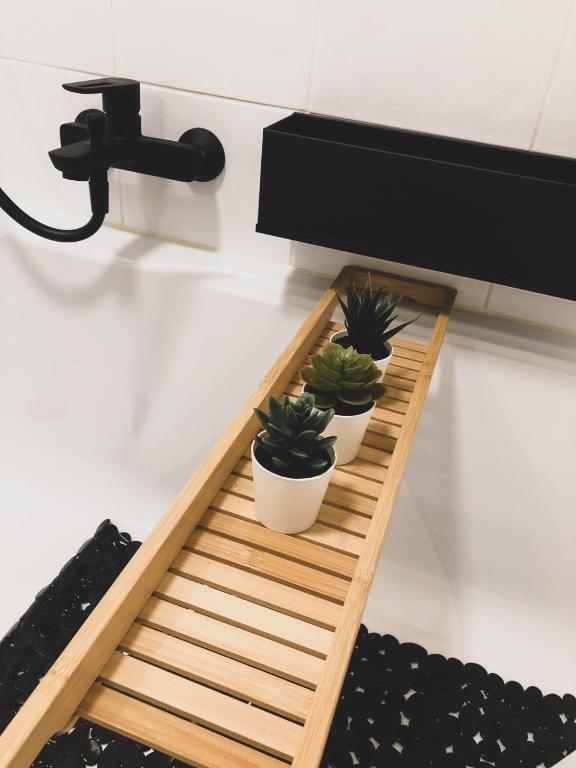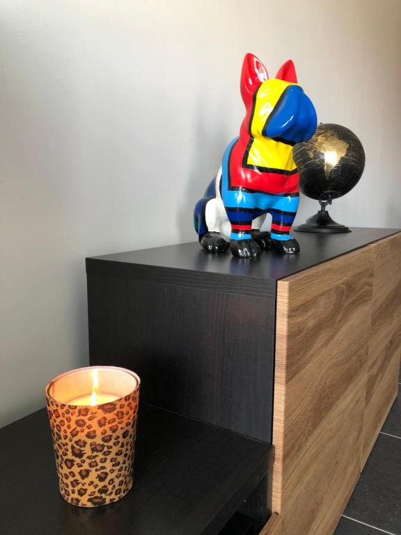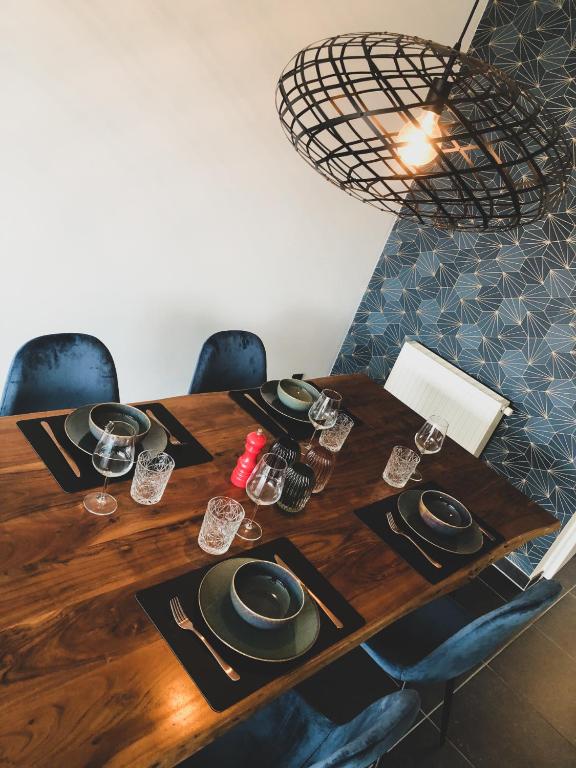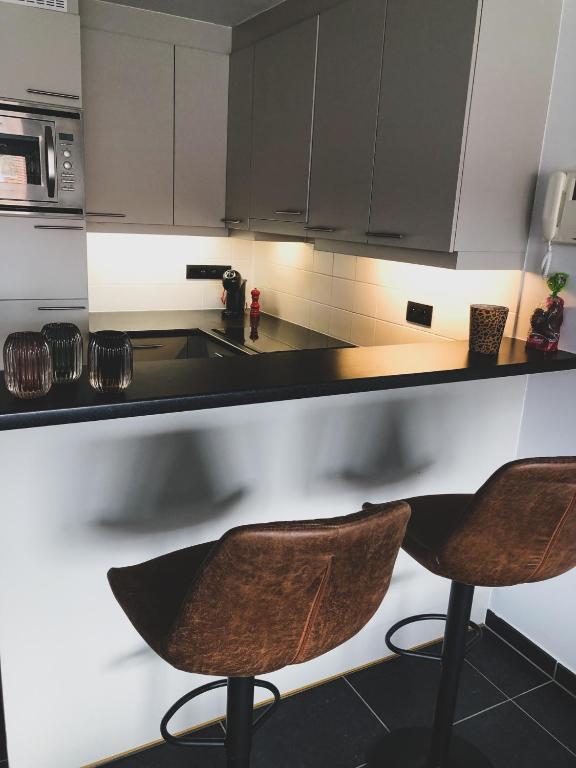 Het appartement heeft een volledig ingerichte keuken met een keramische kookplaat, microgolfoven / over / grill, een vaatwasmachine en een ingebouwde frigo met vriesvakje. Daarnaast kan u ook gebruik maken van ons stijlvol servies, bestek en glazen. Er zijn ook wijn en champagne glazen voorzien. Indien u wenst te koken kan u gebruik maken van onze nieuwe potten en pannen en alle mogelijke kleine keukenmaterialen. Er is ook een koffiemachine van Dolce Gusto aanwezig. De keuken is uitgerust met barkrukken voor gezellige apero!